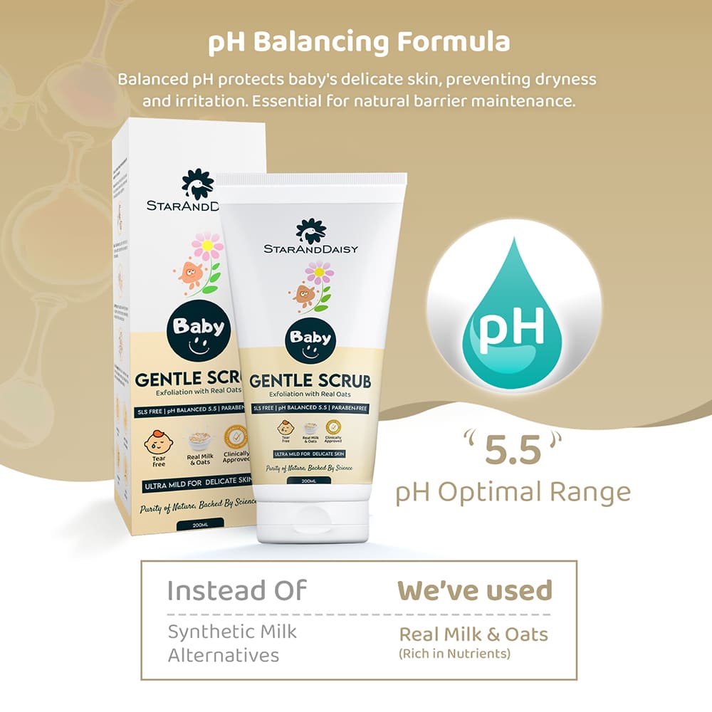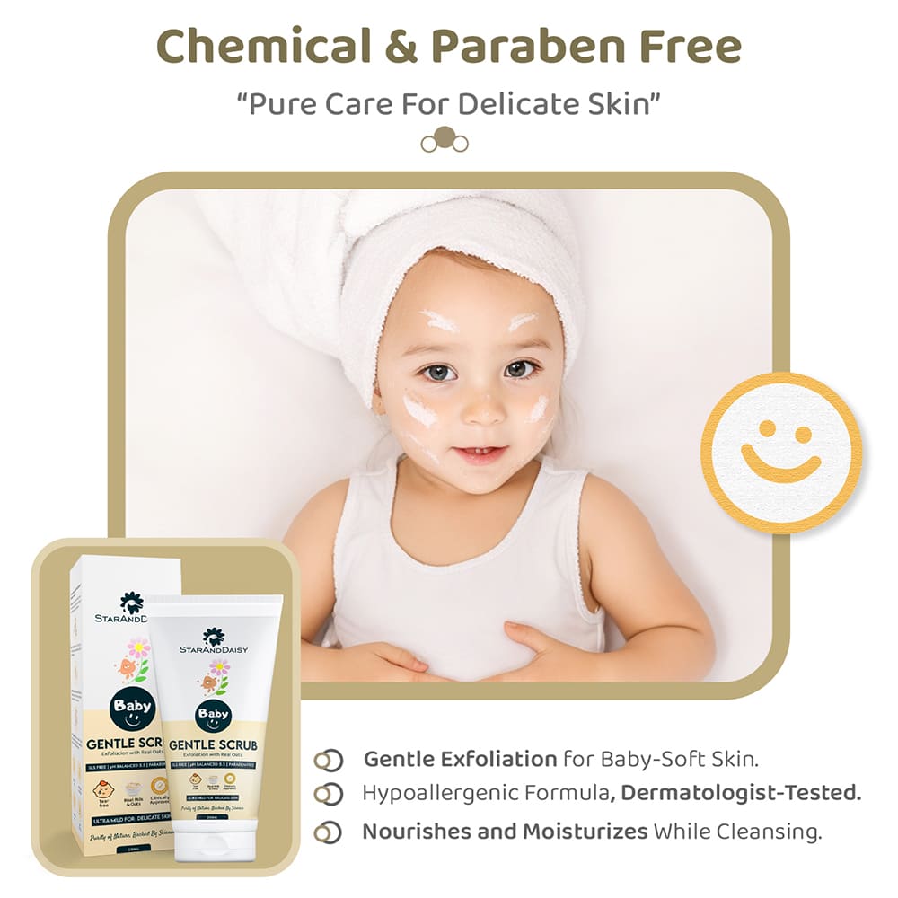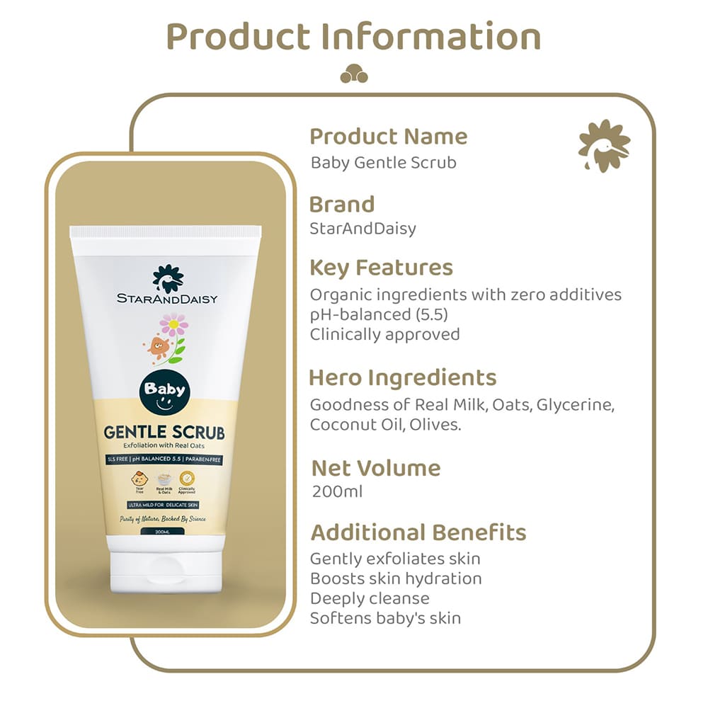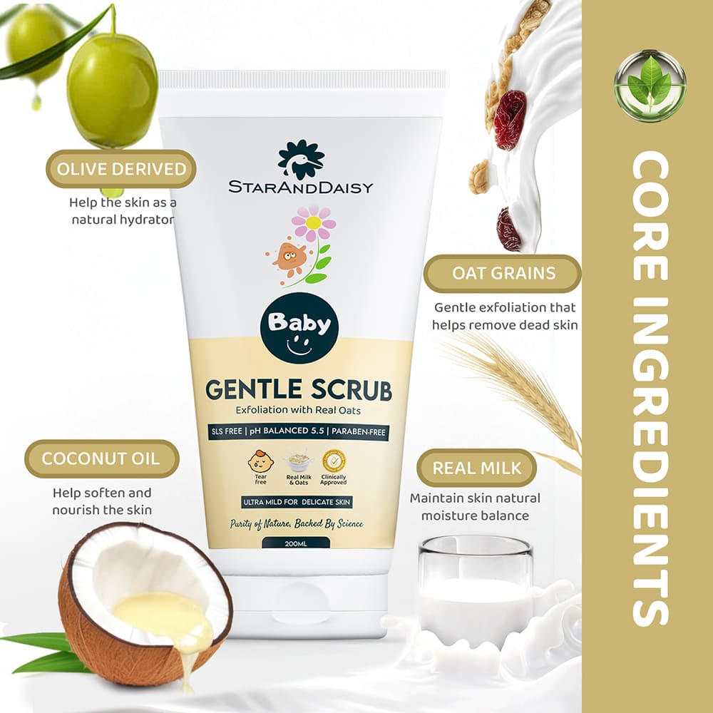 At StarAndDaisy, our inspiration for the gentle baby scrub draws from timeless traditions of caring for delicate baby skin. We blend real milk and oats, inspired by age-old wisdom, in our thoughtfully formulated scrub. Our commitment to purity shines through as we keep our scrub-free from harsh chemicals, artificial fragrances, and parabens.