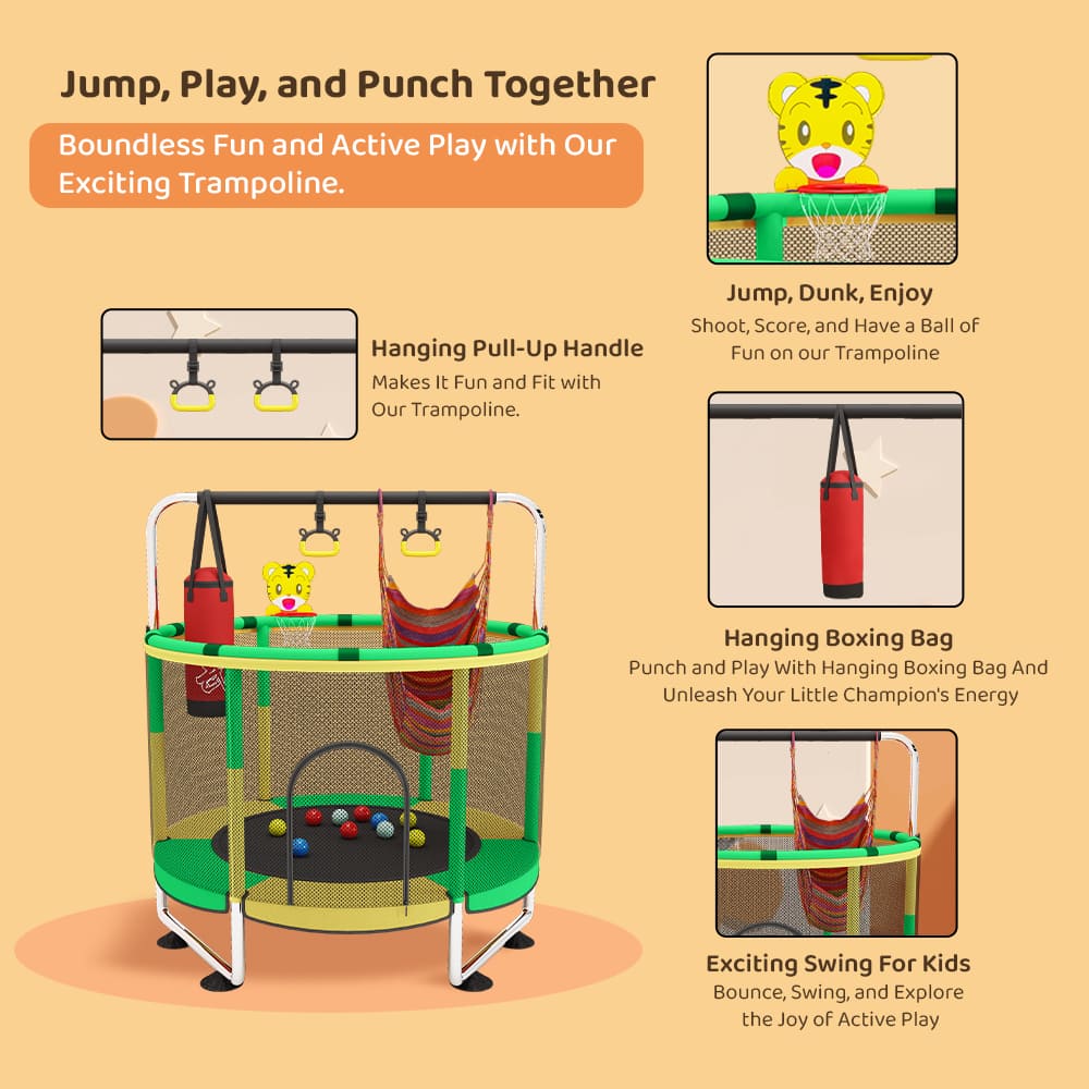 StarAndDaisy Indoor Trampoline for Kids with Safety Net, Pull-Up Handle, Hanging Boxing Bag – Blue & Yellow