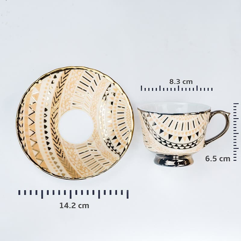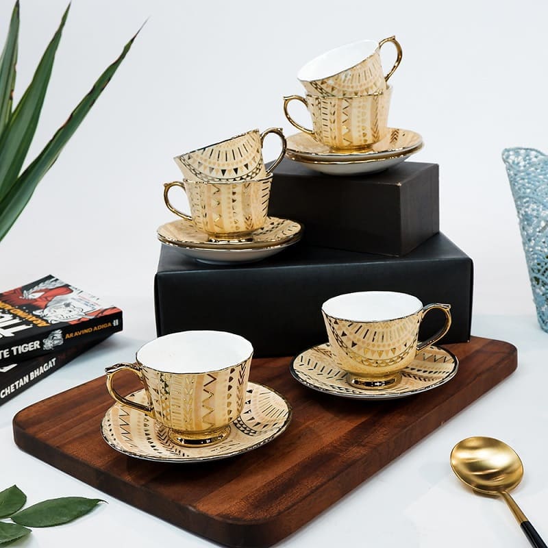 Buy our golden teacup and saucer set that are functional and aesthetically pleasing. The beautiful design and vibrant colors add a touch of elegance and style to your home decor. Impress your guests and enjoy your morning beverages with our ceramic cup and saucer set. It also makes a perfect gift for any occasion, from housewarming parties to weddings.