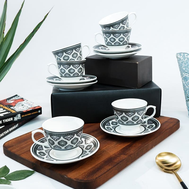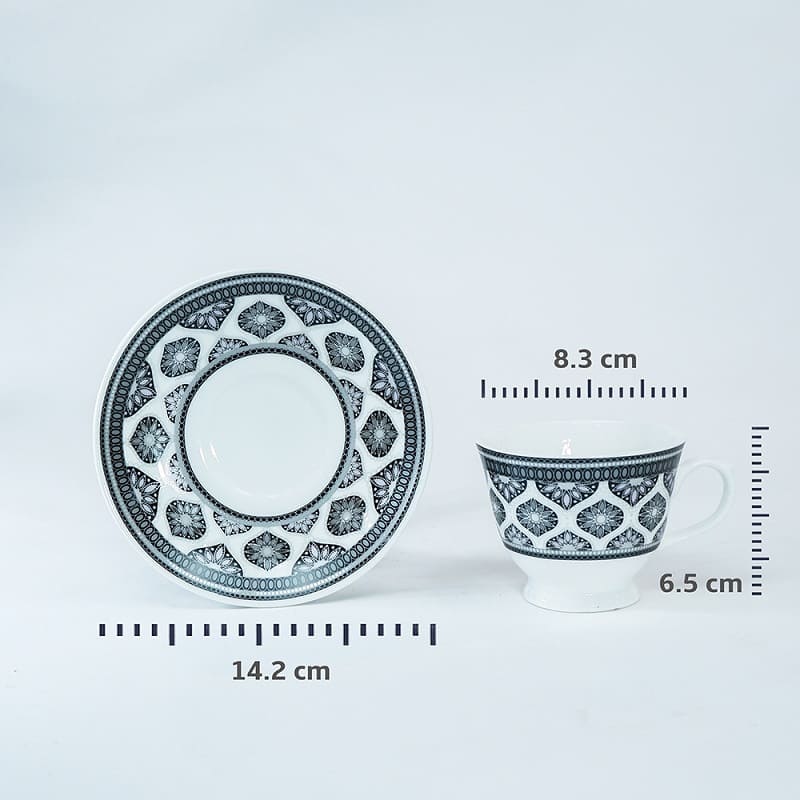 Introducing our beautifully crafted premium cup and saucer set, the perfect addition to any kitchen or dining room. Our set includes cups and saucers, each uniquely designed with intricate patterns and a glossy finish. Made with high-quality ceramic materials, our cups and saucers are durable, dishwasher safe and perfect for daily use.