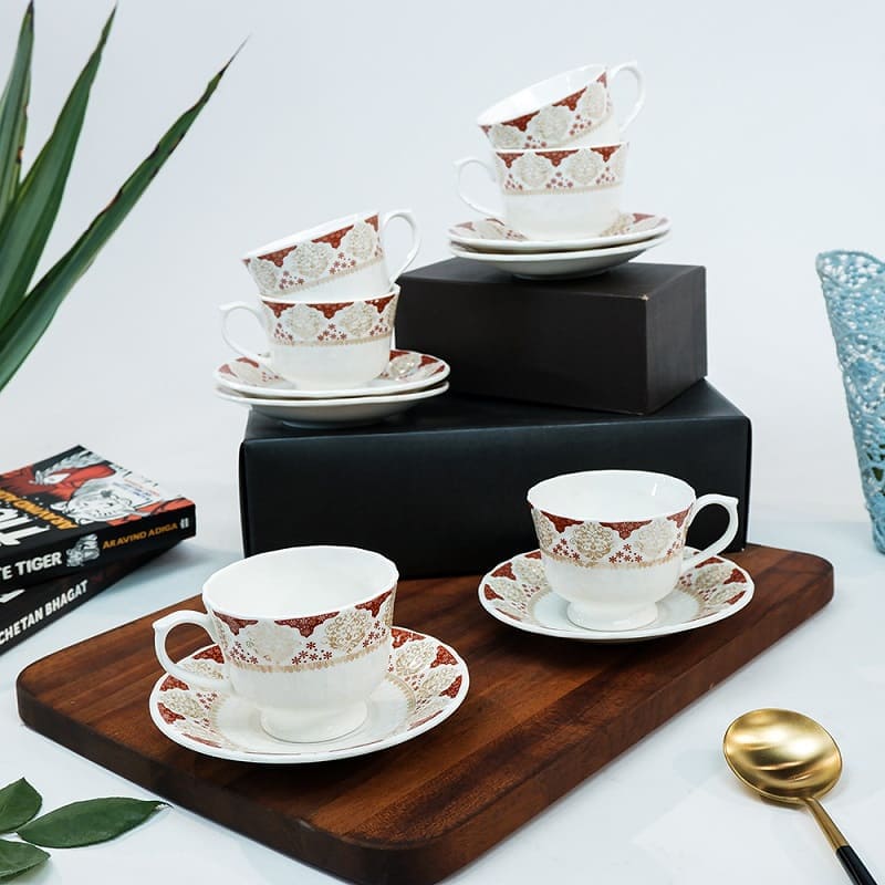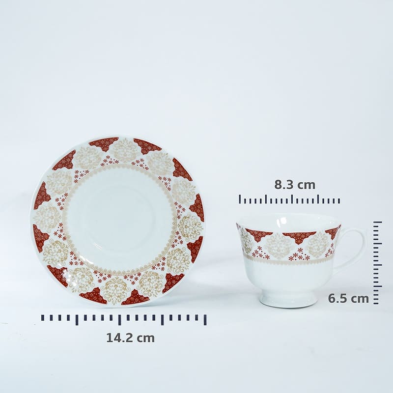 Introducing our beautifully crafted teacup with saucer, the perfect addition to any kitchen or dining room. Our set includes cups and saucers, each uniquely designed with intricate patterns and a glossy finish. Made with high-quality ceramic materials, our cups and saucers are durable, dishwasher safe and perfect for daily use.